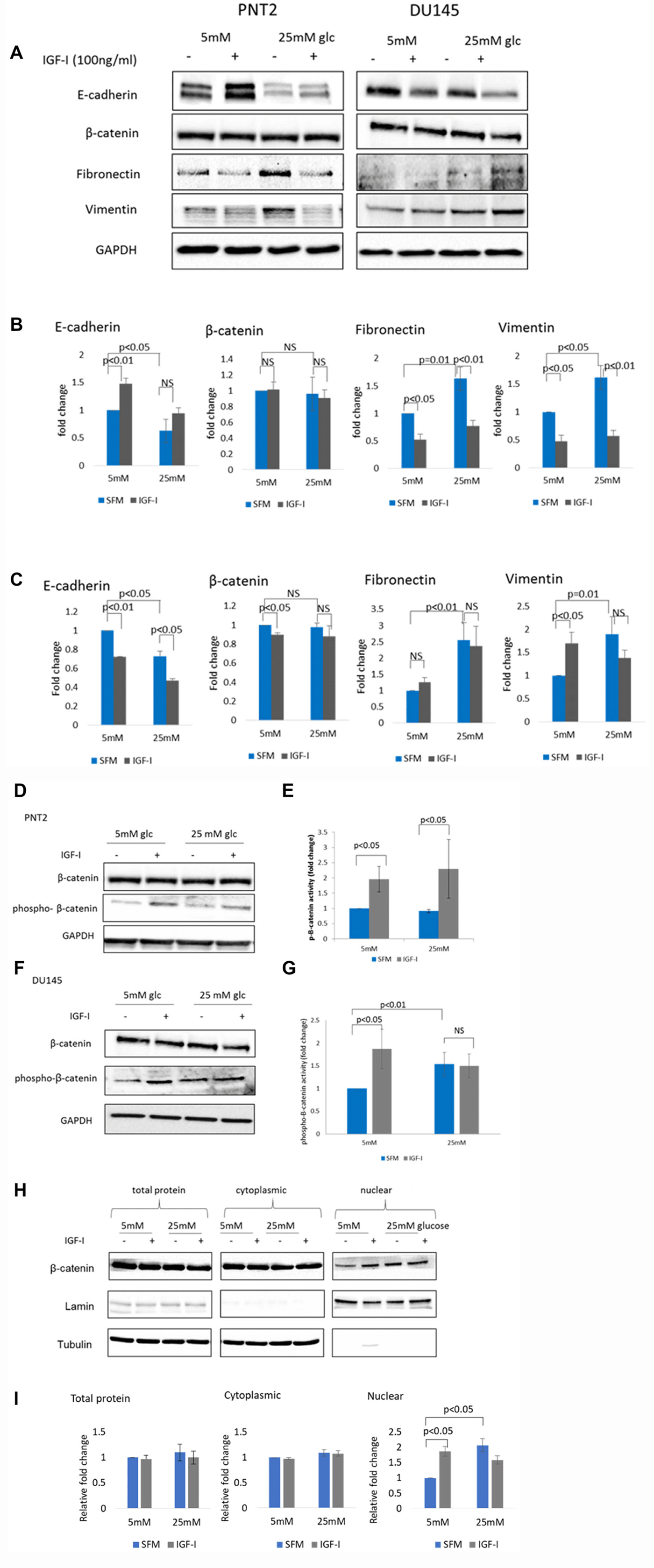Figure 1: The effect of IGF-I on EMT markers in prostate epithelial cells in altered glucose condition. (A) Western blot image shows the effect of IGF-I and high glucose on mesenchymal markers in PNT2 and DU145 cells. Cells were dosed with IGF-I 100 ng/ml for 48 hours in normal (5 mM) and high (25 mM) glucose serum free media. Equal amounts of extracted proteins were separated by SDS-PAGE, blotted to a nitrocellulose membrane and probed with primary antibodies against E-cadherin, β-catenin, fibronectin, vimentin and GAPDH. GAPDH was used as a loading control. Optical densities of protein blots for (B) PNT2 and (C) DU145 were quantitated using image J and normalised to GAPDH. Western blots showing regulation of p-β-catenin in (D) PNT2 and (F) DU145 cells when treated with 100 ng/ml IGF-I in normal (5 mM) and high (25 mM) glucose serum free media. The β-catenin blots in (D) and (F) were reused from β-catenin blots in (A). Optical densities of protein blots for (E) PNT2 and (G) DU145 were quantitated using image J and normalised to GAPDH. Ratio of normalised total β-catenin: p- β-catenin were measured and used as an indicator of β-catenin activity. The data expressed as fold changes relative to control represent mean+/− SE of triplicate experiments. (H) Western blot showing cytosolic and nuclear fractions of protein separated form whole cells lysate (total protein) from DU145 cells treated or untreated with 100 ng/ml IGF-I for 48 hours in normal (5 mM) and high (25 mM) glucose serum free media. Lamin A/C and tubulin act as nuclear and cytoplasmic loading controls respectively. Results shown are representative of three independent experiments. Data are represented as mean ± SEM.